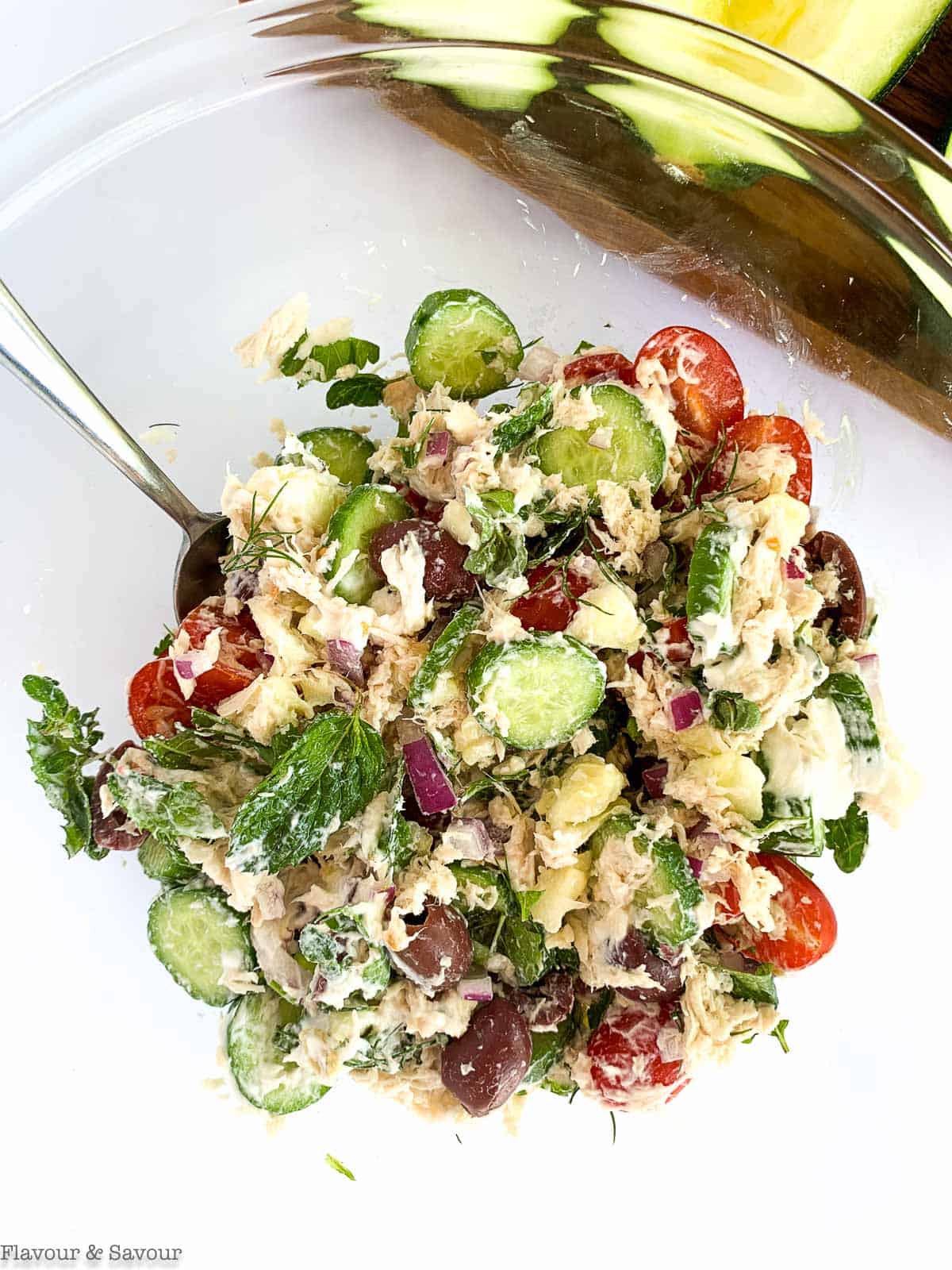 - Meanwhile, in a medium bowl, combine the shredded chicken, tomatoes, cucumbers, red onion, olives, garlic, herbs, lemon juice, lemon zest, yogurt, salt and pepper.