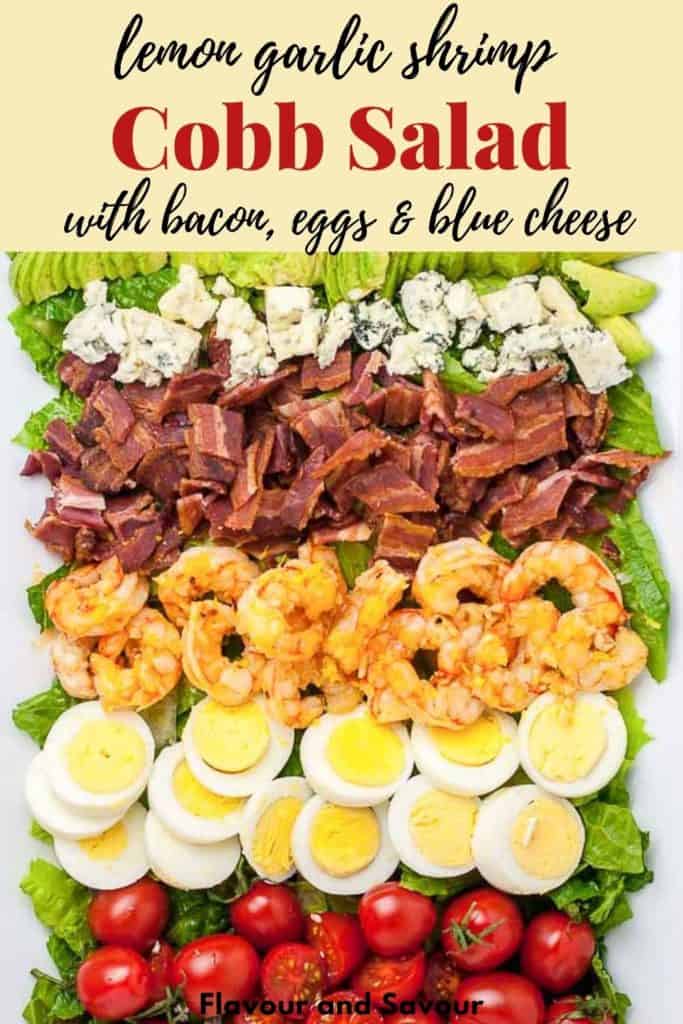 This Lemon Garlic Shrimp Cobb Salad recipe is my twist on a classic Cobb Salad. It's a complete meal in a salad with a light, creamy avocado dressing.
