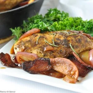 This One-Pan Spiced Chicken with Apples, Bacon, and Onions is sweet and smoky, tender and juicy! Juicy chicken, smoky bacon, and sweet apples, all on a bed of tender onions make an easy chicken breast recipe, perfect for a fall harvest-time dinner.