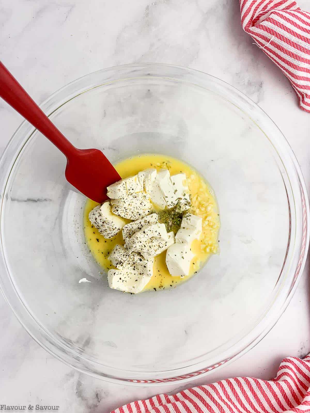- You'll know the cream cheese is soft enough if you can flatten it easily with a spatula. In a medium bowl, use a fork to combine the cream cheese, one eggs, minced garlic, oregano and black pepper.
