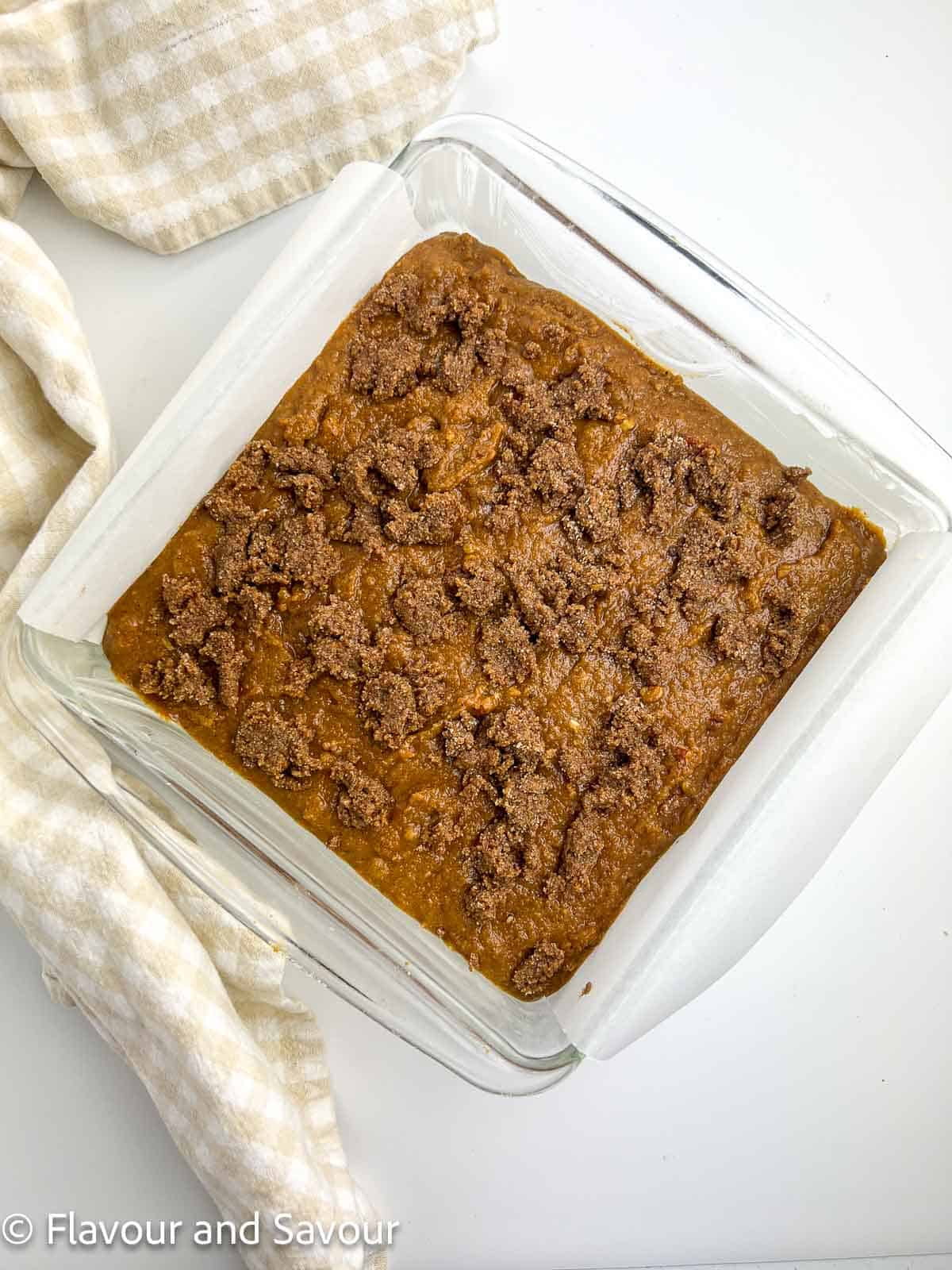 - Spread in prepared pan. Crumble the streusel topping over the top of the batter.