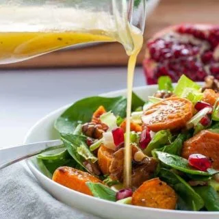 Layer the greens, sweet potatoes, maple-glazed walnuts, pomegranate arils, and crumbled bacon bits, then drizzle and toss with this light, lemony Honey-Dijon dressing just before serving. (Omit the bacon to keep this salad vegan.)