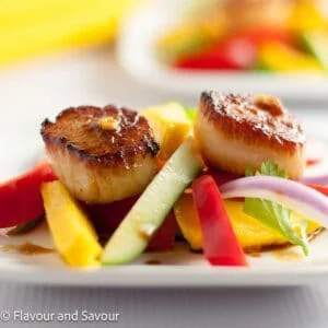 Discover three simple steps to create perfectly seared scallops, then serve them on a refreshing colorful salad made with thinly sliced mango, red pepper, cucumber and red onion. Learning how to sear scallops is easy once you know the tricks!