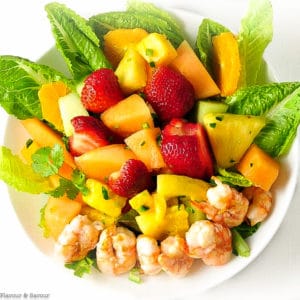 This fruit and shrimp salad is quick, it's easy, it's sweet and juicy, and it's packed full of protein from fresh prawns or shrimp. Not only that, it has just the right amount of crunch from romaine and jicama and a little bite from hot peppers!