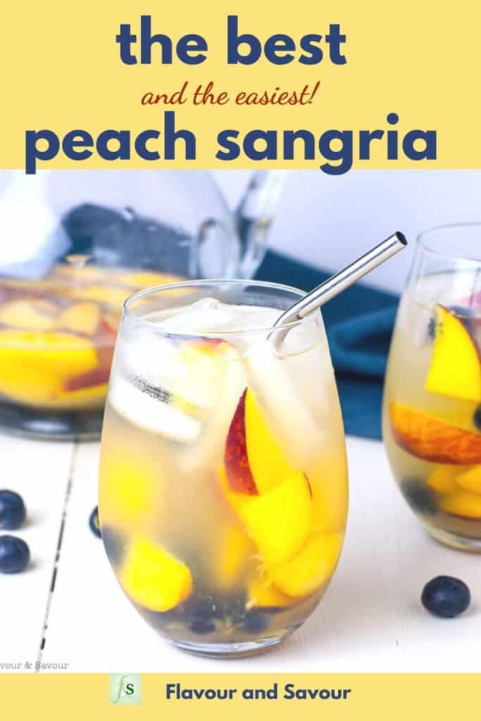 So simple! It's the easiest peach sangria recipe. There's no need to boil water and sugar to make sugar syrup first. Simply combine sliced peaches and blueberries with Triple Sec, lemon juice and sugar, stir to dissolve and let stand to allow the flavours to blend. When you're ready to serve it, add ice and Prosecco (or other sparkling wine) and enjoy!