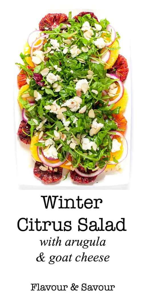 This Winter Citrus Salad with Arugula and Goat Cheese combines sweet oranges, fresh mint and spicy arugula. It's topped with tangy cheese and flaked almonds to make a work of art on a plate.